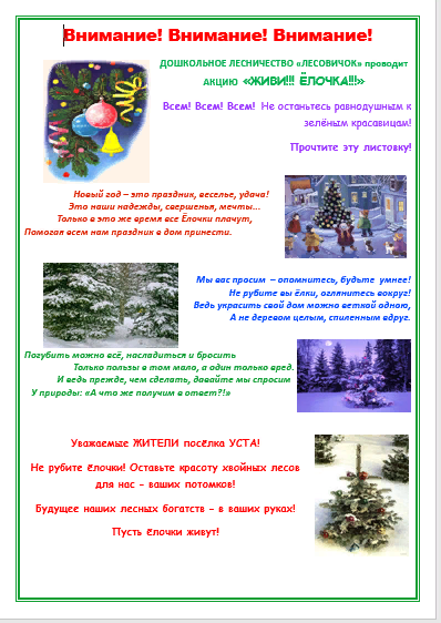 В защиту елочек ребята дошкольного лесничества «Лесовичок» провели акцию «Ёлочка, живи!», целью которой являлась пропаганда гуманного отношения к природе и её охрана в предновогодние дни. Ребята изготовили информационные листовки для родителей и прохожих. «Лесовички» приготовили небольшое выступление для всех групп детского сада. Дети читали стихи, спели песню «Маленькой ёлочке не холодно зимой». В защиту елочек сделали большой агитационный плакат и разместили его при входе в детский сад, там же организовали выставку елочек, которые смастерили родители вместе с детьми.