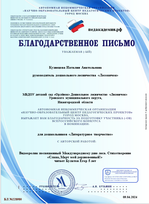 Руководитель дошкольного лесничества "Лесовичок" Кузнецова Н.А.