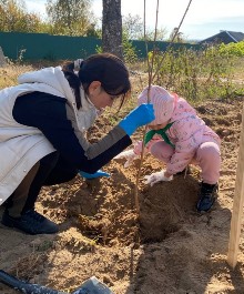 На территории центральной площади посёлка Уста «Лесовичками» было высажено пять саженцев сирени. В субботнике также приняли участие родители детей.