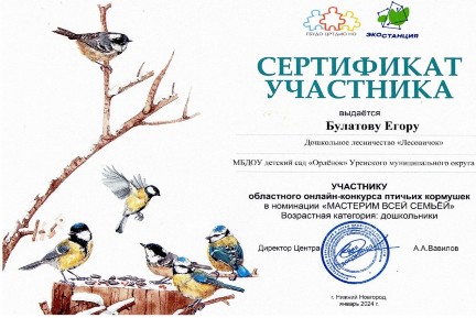 Группа ЭКОстанция Нижегородской области в Контакте проводила областной онлайн-конкурс птичьих кормушек с 14 ноября 2023г. по 22 января 2024г. Дети и их родители из дошкольного лесничества «Лесовичок» приняли в нем участие.