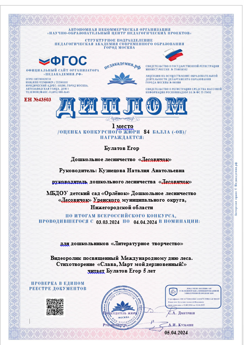 За активное участие в жизни дошкольного лесничества родителей воспитанников Козлова С.А. и Демидова А.В. наградили грамотами.