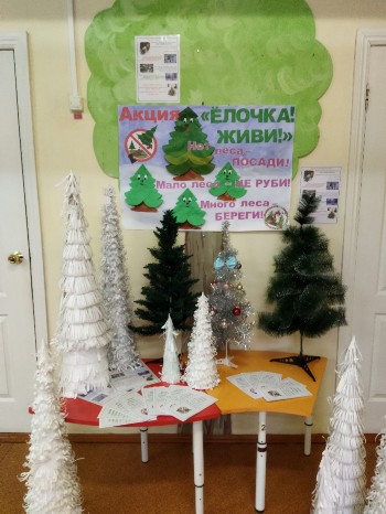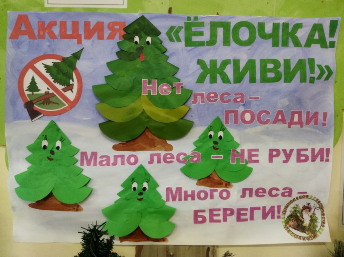 В защиту елочек ребята дошкольного лесничества «Лесовичок» провели акцию «Ёлочка, живи!», целью которой являлась пропаганда гуманного отношения к природе и её охрана в предновогодние дни. Ребята изготовили информационные листовки для родителей и прохожих. «Лесовички» приготовили небольшое выступление для всех групп детского сада. Дети читали стихи, спели песню «Маленькой ёлочке не холодно зимой». В защиту елочек сделали большой агитационный плакат и разместили его при входе в детский сад, там же организовали выставку елочек, которые смастерили родители вместе с детьми.