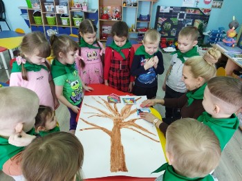 В начале мероприятия Дарья Игоревна провела с детьми беседу на тему «Лес и его обитатели», юные лесовички с интересом отвечали на вопросы, а во время дидактической игры «С какого дерева листок?» и «С какой ветки детка?» дети показали хорошие знания о видах деревьев, а также быстро ориентировались в предложенных заданиях.