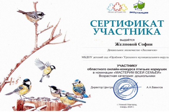 Группа ЭКОстанция Нижегородской области в Контакте проводила областной онлайн-конкурс птичьих кормушек с 14 ноября 2023г. по 22 января 2024г. Дети и их родители из дошкольного лесничества «Лесовичок» приняли в нем участие.