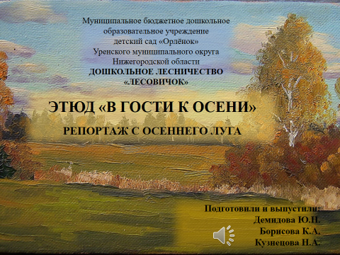 Добрый день. Мы ведем свой репортаж с осеннего луга. Сегодня дети из дошкольного лесничества «Лесовичок» вместе с руководителем и родителями приехали на экскурсию на осенний луг, чтобы ближе познакомиться и рассмотреть знакомые травянистые растения, найти лекарственные травы и вспомнить их лекарственные свойства.