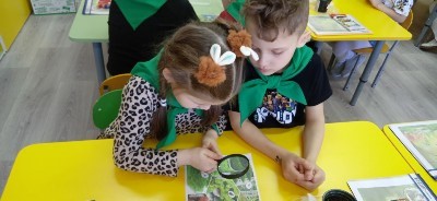 Самой познавательной стала встреча с умной Совой. Она открыла нам тайны скрытые в коре деревьев и раздала волшебные лупы. Ребята с изумлением рассматривали, как кипит жизнь в маленьком мире насекомых!