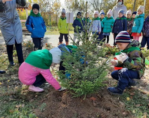 Посадка елочек на территории детского сада совместно с руководителем лесхоза Е.Г. Плешаковым и заслуженным лесоводом Р.Ф Д.И. Гулиным.